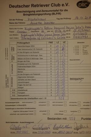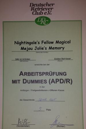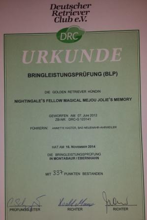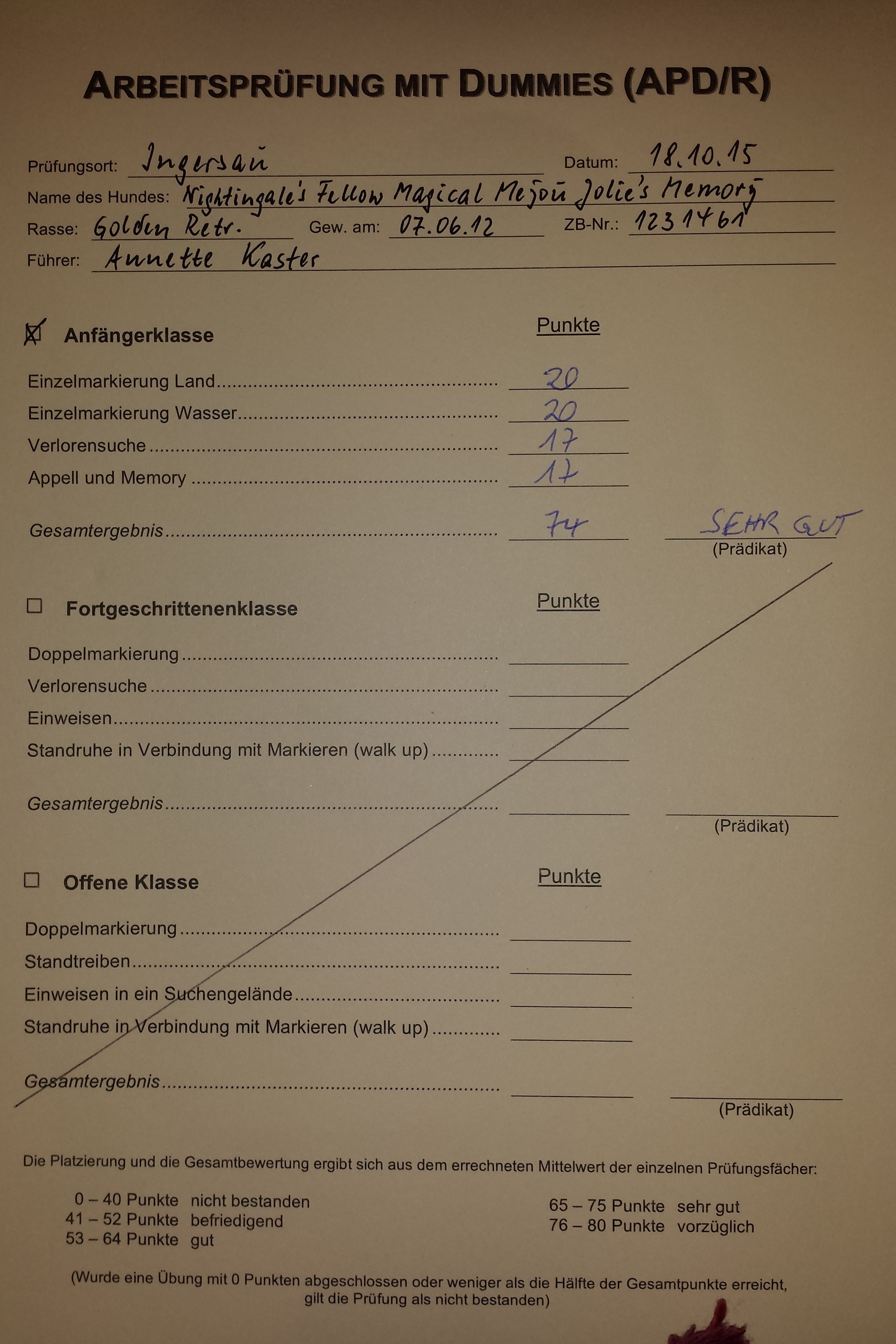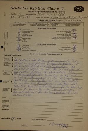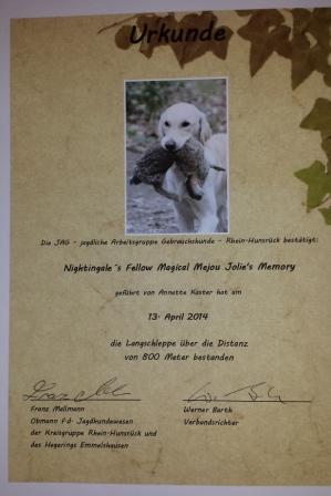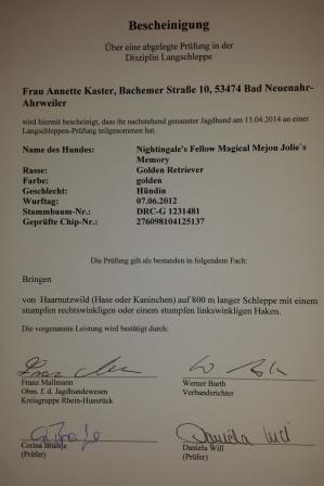 19.03.2016: Langschleppe (1200m) 18.10.2015: Dummyprüfung A des DRC (DPR/A) in Ingersau: Sehr Gut (74/80 Pkten), 5. Platz (von 24 Startern), Richterin: Betty Schwieren