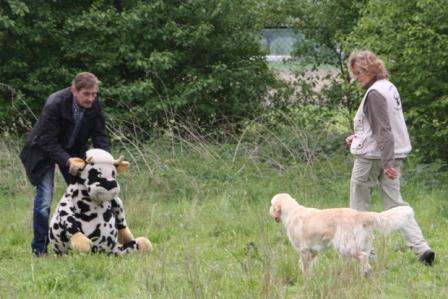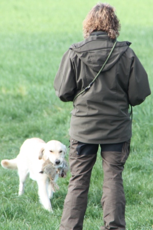 Eine akustisch leicht sensible, optisch sichere Hündin. Sie hat einen sehr starken Menschbezug und ist sehr leichtführig, gute Nase, guter Beute- und Bringtrieb. Sie ist sehr temperamentvoll, wird wahrscheinlich sehr führerbezogen. Ein Arbeitshund!