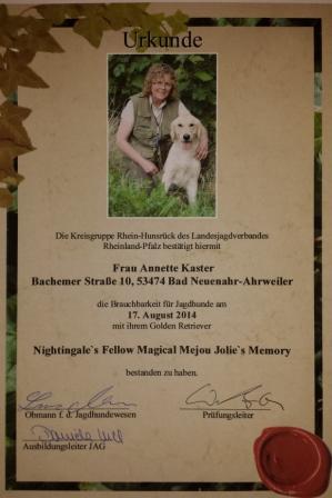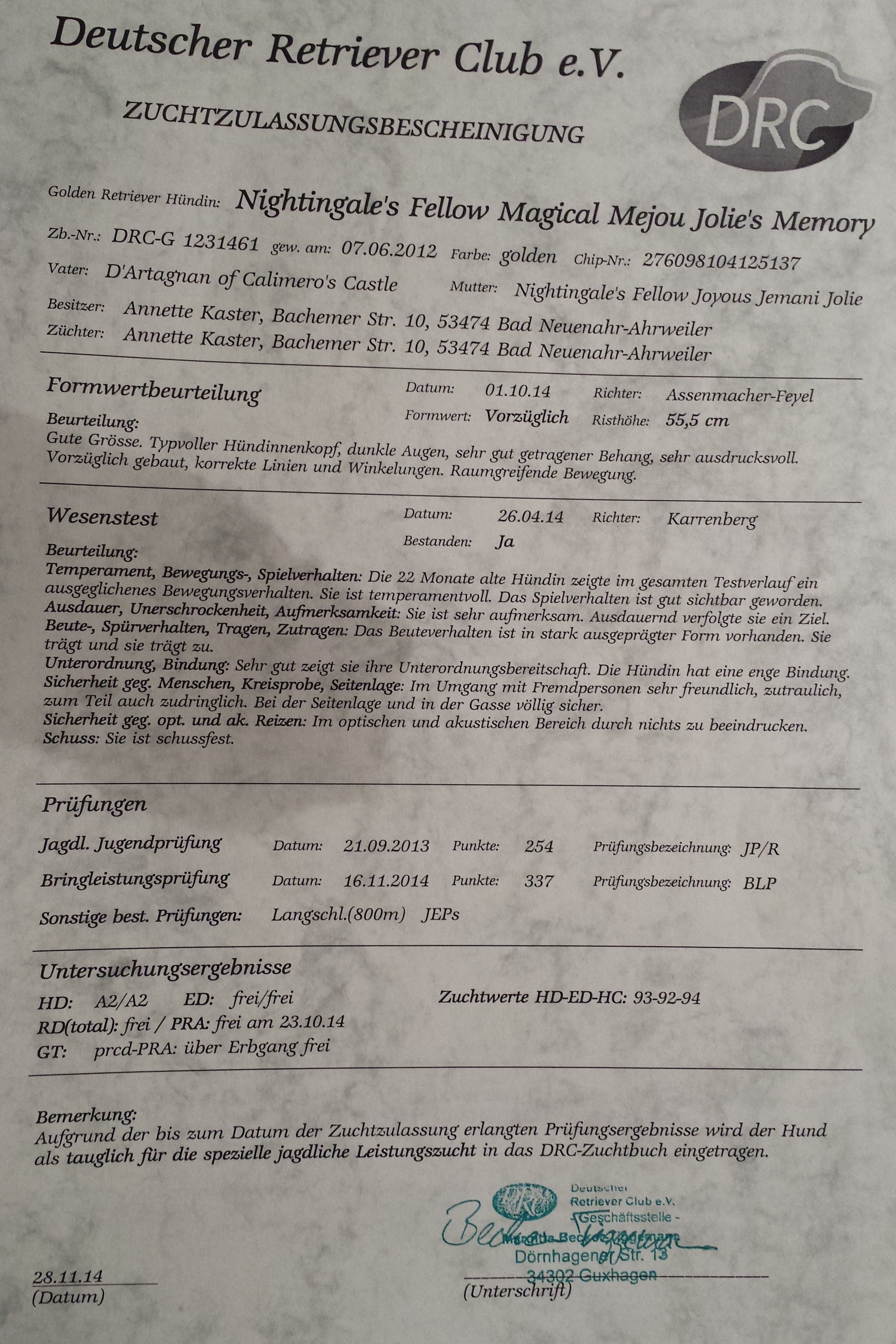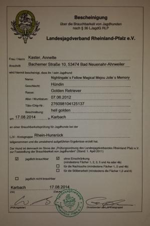 | Zuchtzulassung: | 28.11.2014; tgl. f. d. spez. jagdl. Leistungszucht | |
