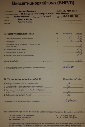 10.04.2015: Begleithundeprüfung A+B (BHP/R) in Balenbach-Merten: 76 Pkte, Vorzüglich, 2. Platz