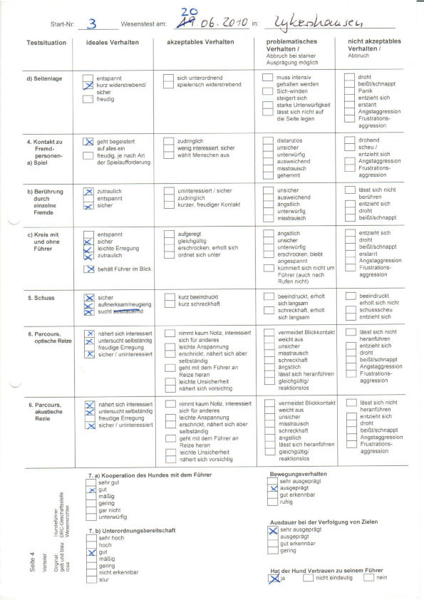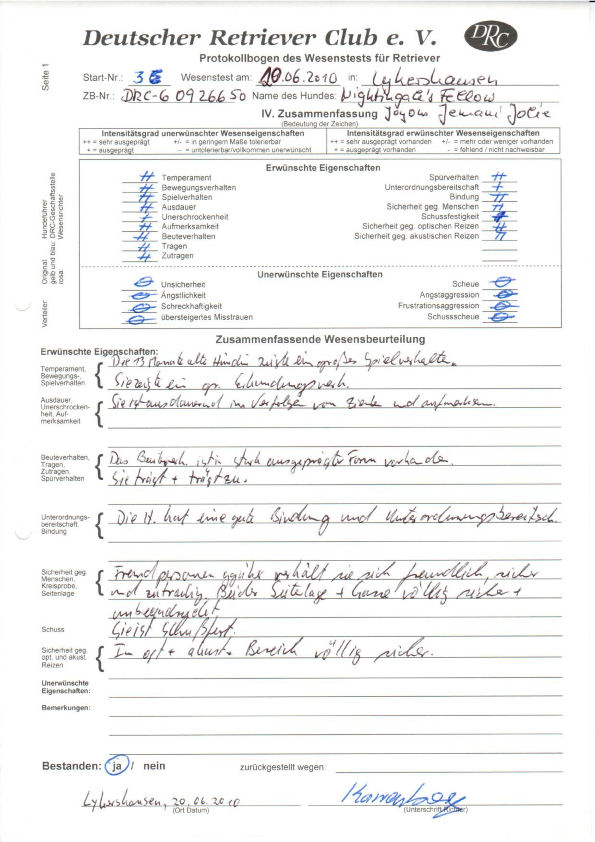 Eine optisch und akustisch sichere Hündin. Sie zeigt sehr guten Menschenbezug und ist sehr leichtführig. Sie hat hohen Beutetrieb und guten Bringtrieb. Sie setzt die Nase gut ein.