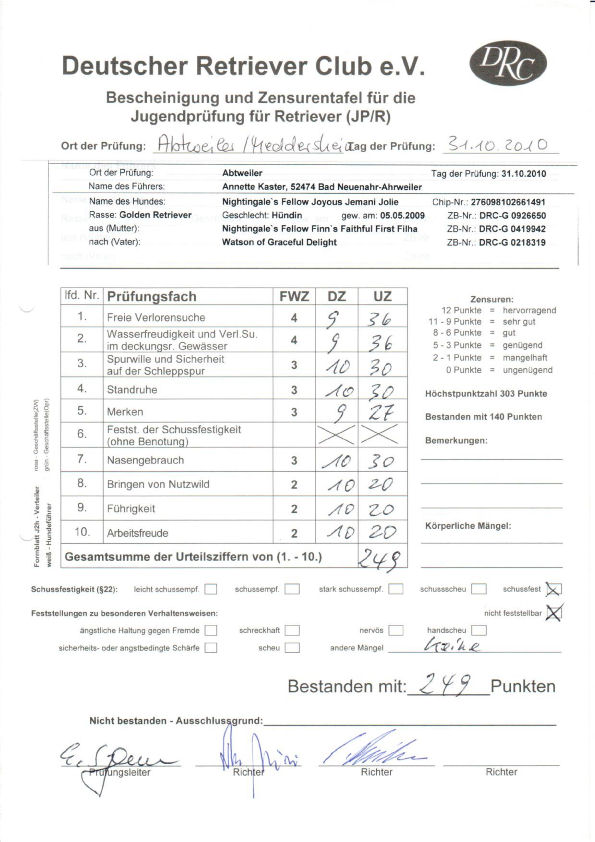 31.10.2010: Jugendprüfung für Retriever des DRC (JPR) in Abtweiler, Richter: Edmund Sagawe; 249 Pkte
