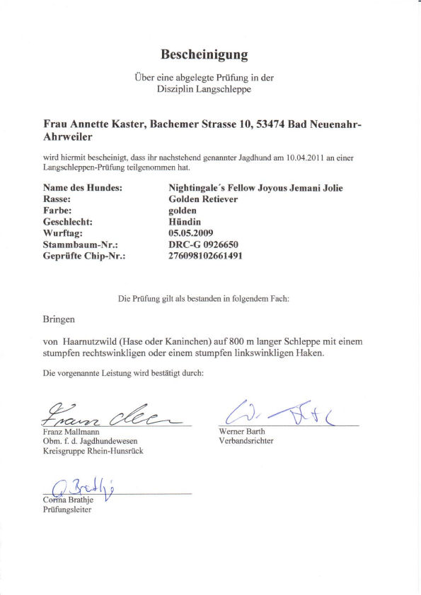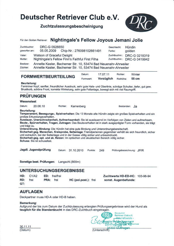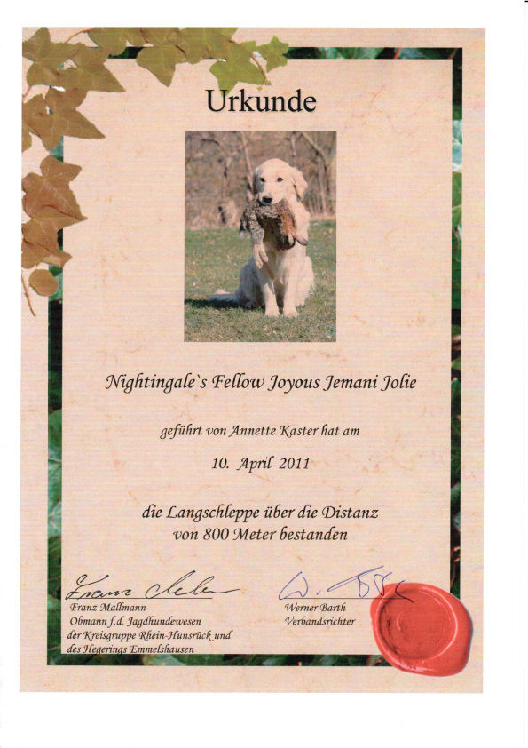 | Zuchtzulassung: | 30.11.11, tgl. f. d. spez. jagdl. Leistungezucht | |