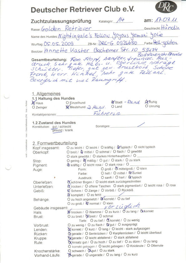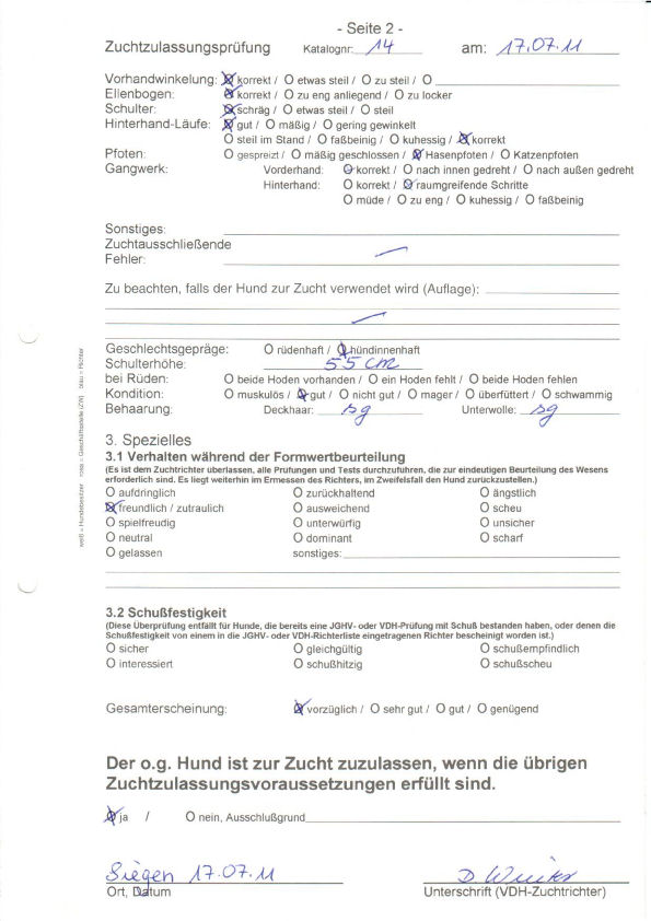 | Zuchtzulassungsprüfung / Formwert: | 17.07.2011:Vorzüglich | |
