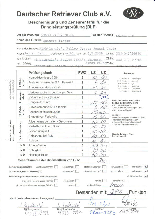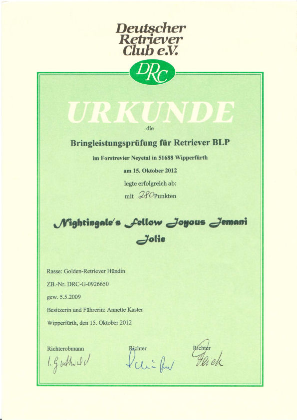 15.10.2012: Bringleistungsprüfung für Retriever (BLP), Richterin: Inga Gottwald, 280 Pkte