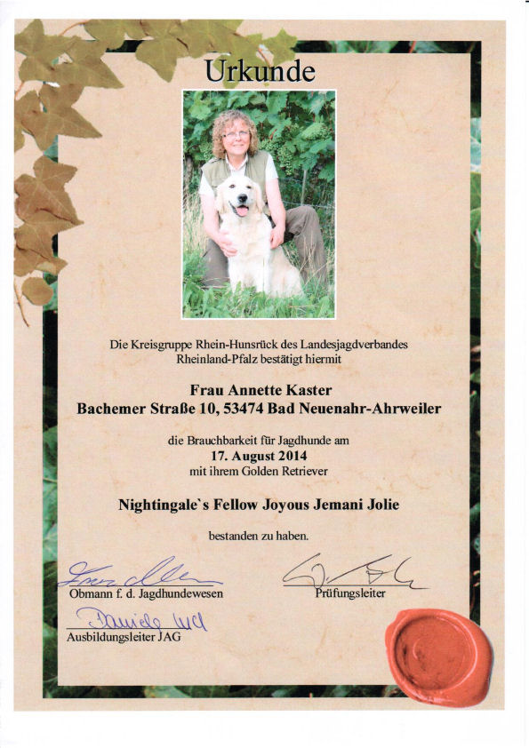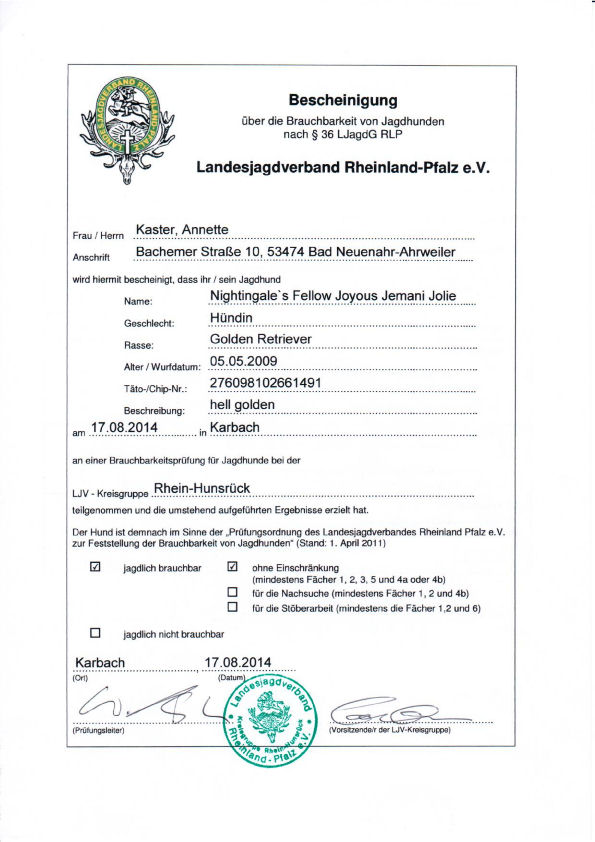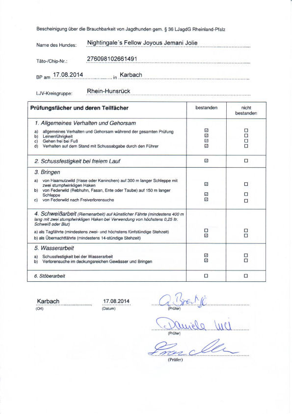 Seit Bestehen ihrer BLP (in 2012) ist Jolie tgl. für die jagdl. Leistungszucht.'