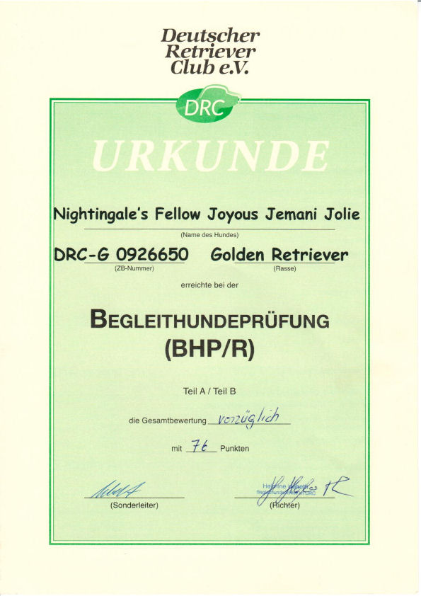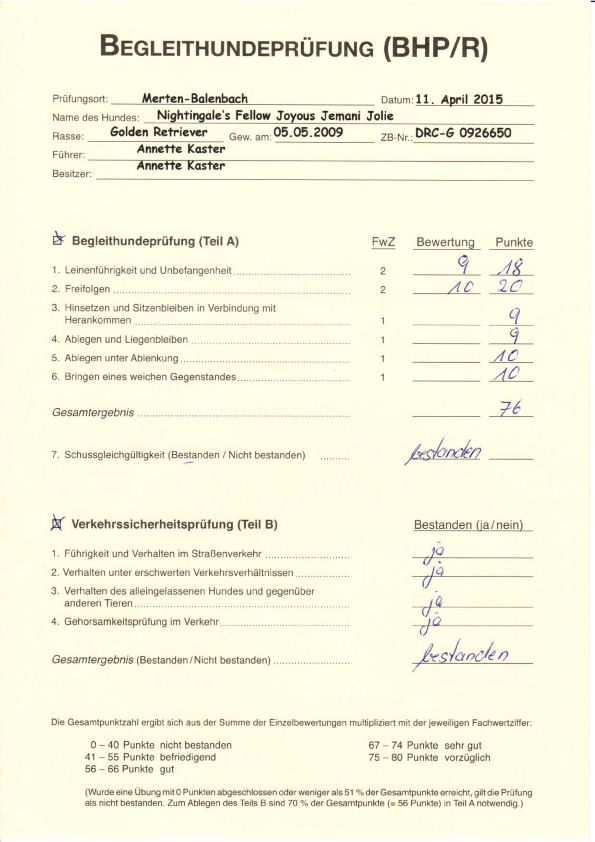 10.04.2015: Begleithundeprüfung A+B (BHP/R) des DRC in Balenbach-Merten: 76 Pkte, Vorzüglich, 2. Platz; Richterin: Helmie Habeth