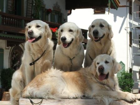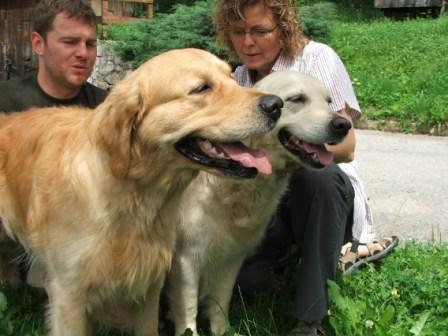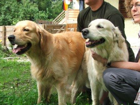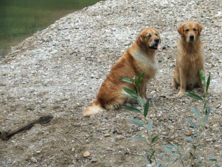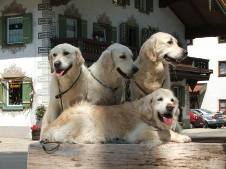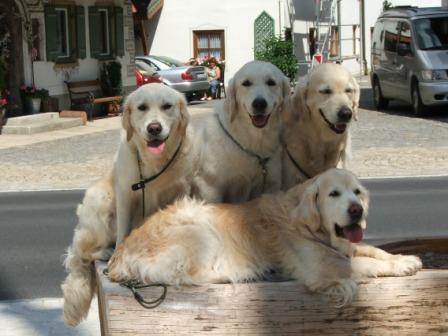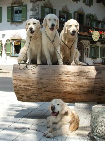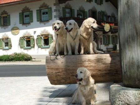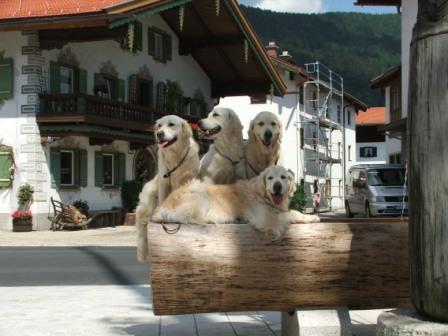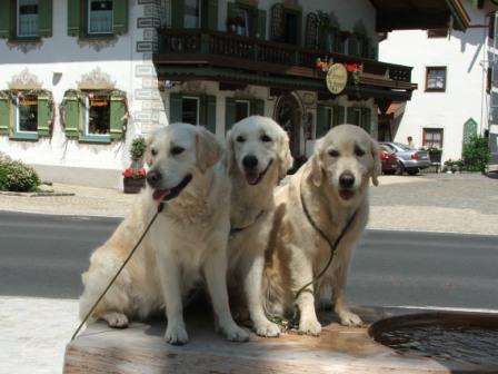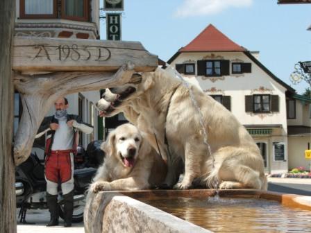 Am nächsten Tag absolvierten Sabine und ich mit Feline und Filha noch ein Dummytraining am Wasser und begaben uns dann auf eine Sightseeing-Tour im Chiemgau. In Ruhpolding zogen wir alle Blicke und klickende Fotoapparate auf uns, als wir unsere Hunde auf einem Brunnen drapierten und einige postkartenreife Fotos schossen. |