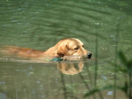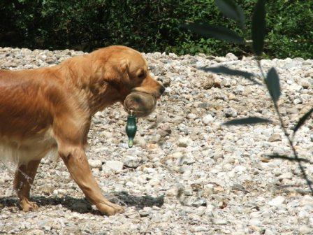 Bruno apportiert eine "Dummy-Ente" aus dem Wasser |