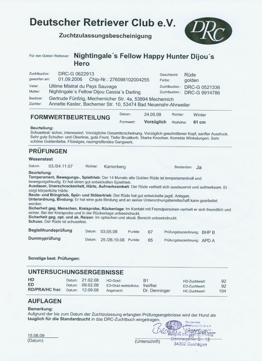HD: B1, ED: frei/frei ZS: Ok (vollständige Schere) HC/PRA/RD: frei/frei/frei Zuchtwerte: 91/93/104 |