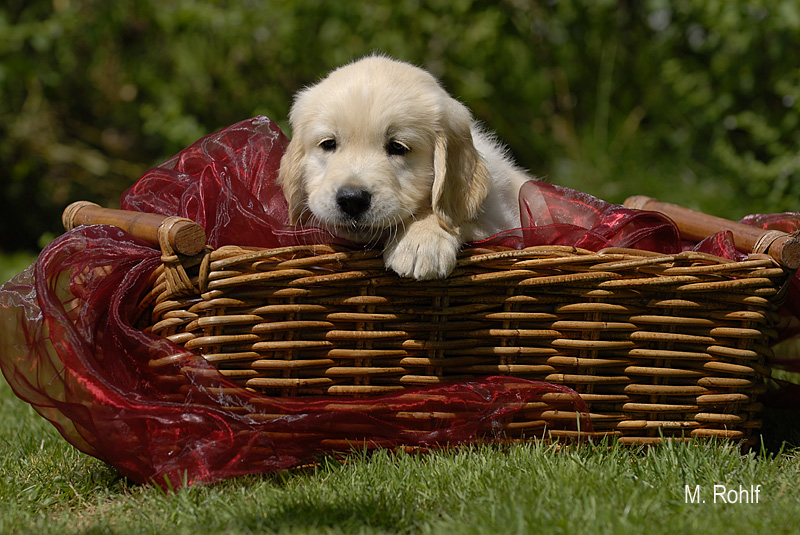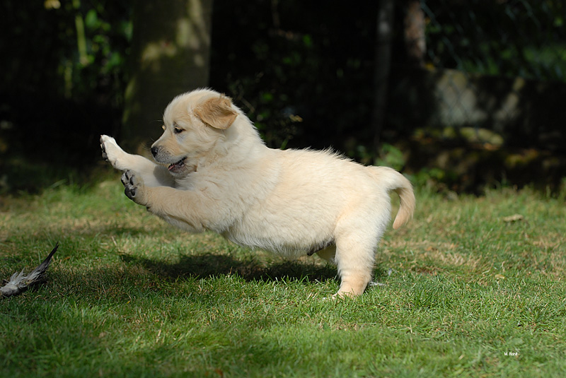 | 15 Mon. alter Rüde mit ausdrucksvollem, mask. Kopf, korr. Gebiß, dunkles Pigment, ausgezeichnet gelagerte Schulter und Oberarm, gut gewölbter Brustkorb, sehr schöne Hinterhandwinkelung, Rückenlinie nicht ganz gerade, Kruppe leicht abfallend, auch in der Bewegung, korr. Gangwerk, könnte etwas schwungvoller sein |