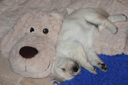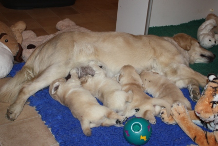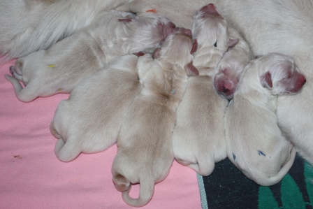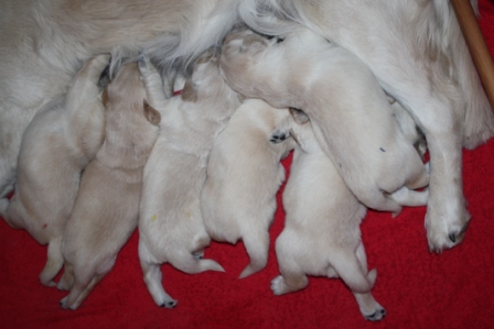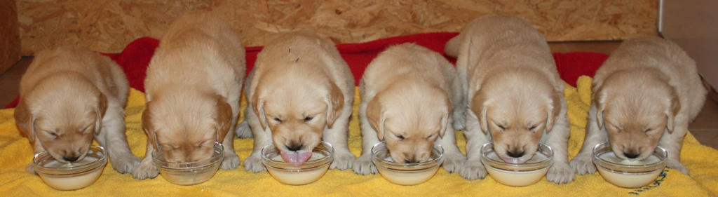 (26. Lebenstag):Die Welpenmilch hat jeder Welpe (allein) souverän getrunken. 26.03.2012