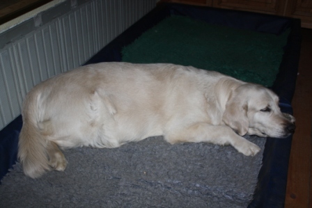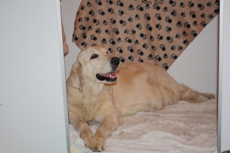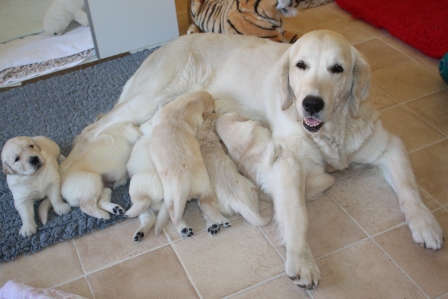 Filha meint, sie könnte die Welpen auch schon mal im Sitzen säugen - na ja!? Die eine oder andere Ruhepause außerhalb der Wurfkiste geht auch schon!05.03.2012