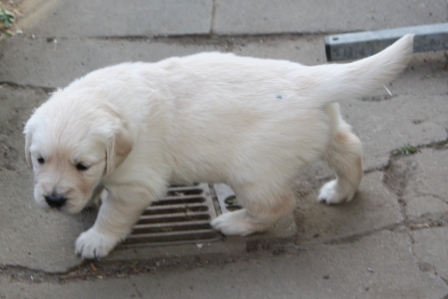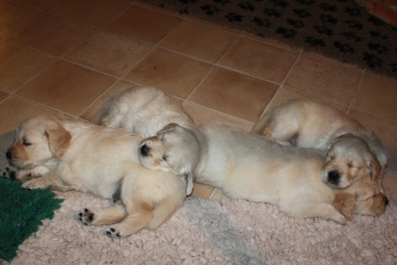(35. Lebenstag):Heute sind wir schon fünf Wochen alt. Mr Green (4000 gr) und Mr Black (4120 gr) haben die 4000 gr-Marke überschritten. Schlusslicht bildet immer noch Mrs Yellow (3740 gr) . Die Anderen liegen dazwischen - also alle liegen eng beieinander und sind nicht nur gewichtsmäßig, sondern auch optisch und wesensmäßig sehr ähnlich. Sie sind alle sehr temperamentvoll - im Garten lassen sie echt die Sau raus! Auf der anderen Seite sind sie sehr lieb und ausgeglichen - bisher ist noch niemand durch den Futternapf gelatscht und auch den Wassernapf nutzen sie sehr diszipliniert :-) - sehr anständige Welpen!