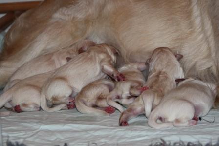 (25. Lebenstag)Heute bekommen wir zum ersten Mal Zusatzfutter zu Mamas Milchbar. Wir schlecken die Welpenmilch schon ganz ordentlich! 31.05.2013