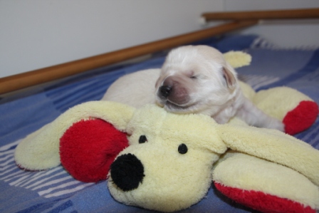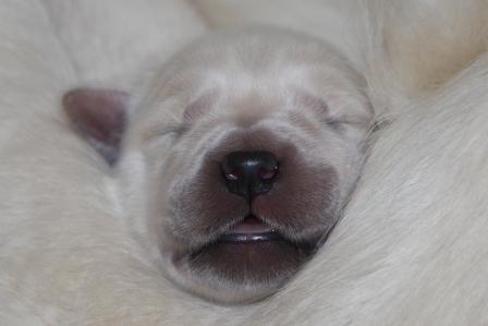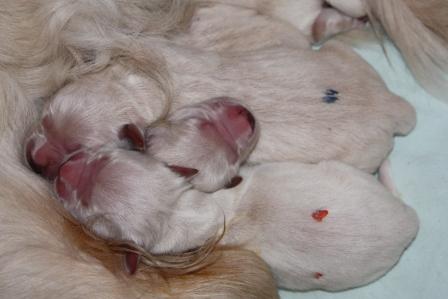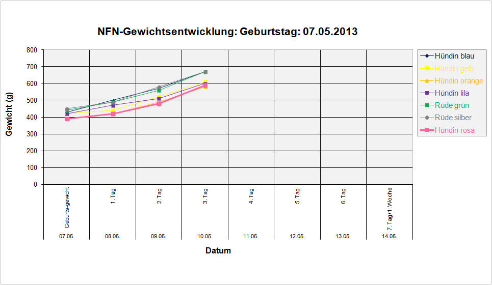 (1. Lebenstag)Jolie und den Welpen geht es prächtig. Das Gewicht lag ja bereits bei der Geburt gut zusammen. Mrs Blue hat 70gr zugenommen und führt die sieben Zwerge gewichtsmäßig mit 500 gr an. Mrs Orange und Mrs Rosa bilden mit jeweils 420gr die Schlusslichter :-)! Das Pigment entwickelt sich bereits! 07.05.2013