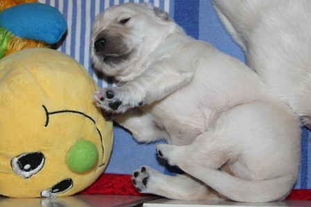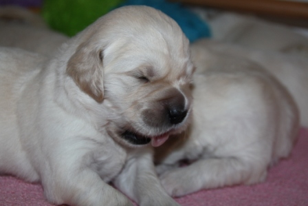 (4. Lebenstag)Die Kleinen entwickeln sich prächtig. Mr. Silver hat heute 800 gr und Mrs Orange bildet mit 640 gr das Schlusslicht. Jolie hält sich immer mal wieder außerhalb der Wurfkiste auf, kümmert sich aber rührend um die Kleinen, wenn sie mal quaken:-)! Noch lässt sie ihre Tochter Mejou nicht an die Welpen, auch nicht Filha, doch diese ignoriert die Kleinen eh weitestgehend.