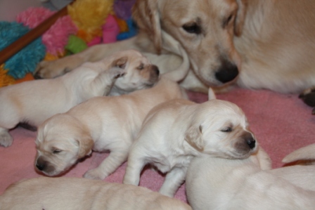(24. Lebenstag)Annette schon wieder auf Tour - Wasserseminar mit Mejou in Abtweiler. Unsere liebe Kiki kümmert sich um die Welpen! 30.05.2013