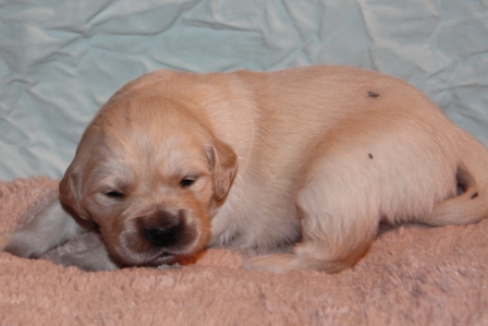 (19. Lebenstag)Heute gab es die erste Wurmkur mit Welpan - da unsere Mutter ja mit Advocaat entwurmt wurde, brauchten wir noch nicht früher ran. Das Zeug hat gar nicht so schlecht geschmeckt, dennoch hatten wir anschließend alle ein paar rose Fleckchen :-)!
